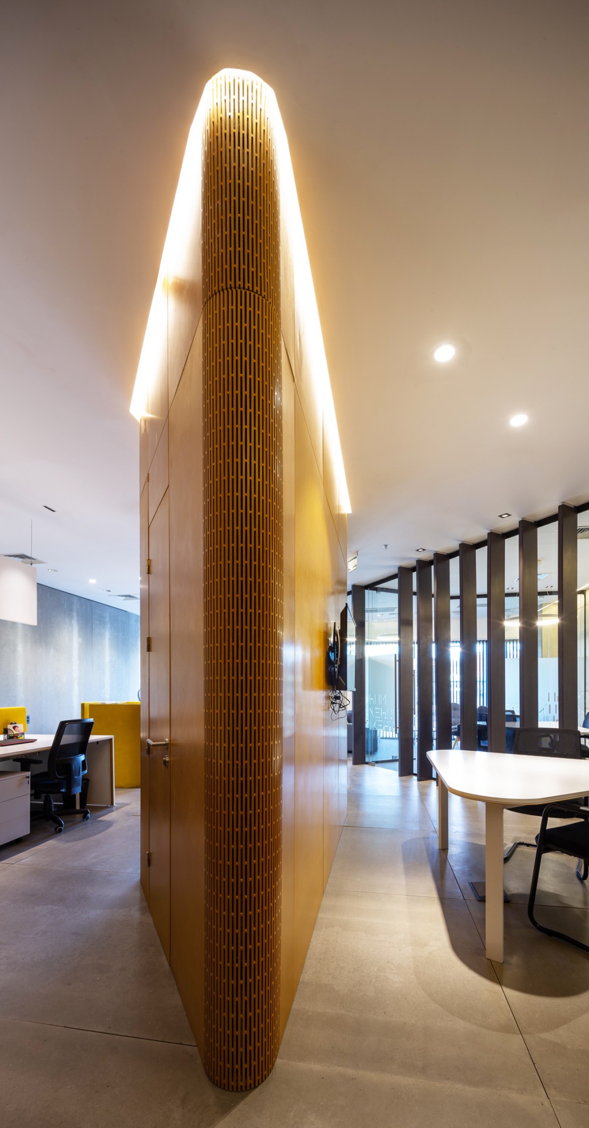 Los determinados usos espaciales asociados a una manera explícita de concebir las funciones de oficina definieron el equipamiento en esta obra donde el mobiliario y el detalle sobre vinilos y terminaciones diseñados especialmente para el lugar, no se pueden disociar del proyecto de arquitectura.